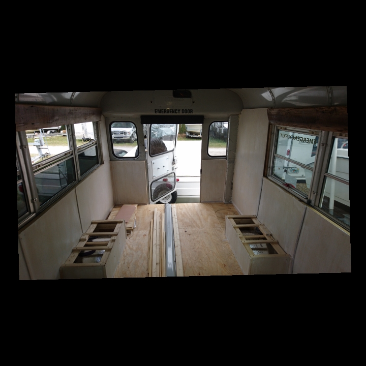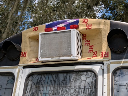 - Back wall window A/C unit. I was going to replace it this year and modify the opening to make it tilt back a bit more. The wall around it is not finished. The black tape is just covering the metal edge and holes from the old bus AC unit I paid to have removed and capped off.