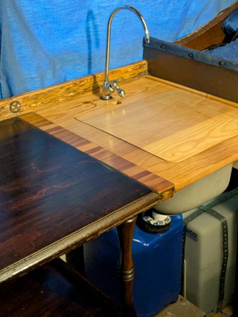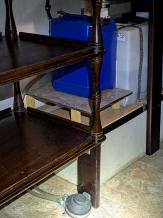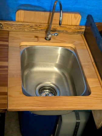 - 10 gallon water storage tank under bed on wheel well with foot pump.