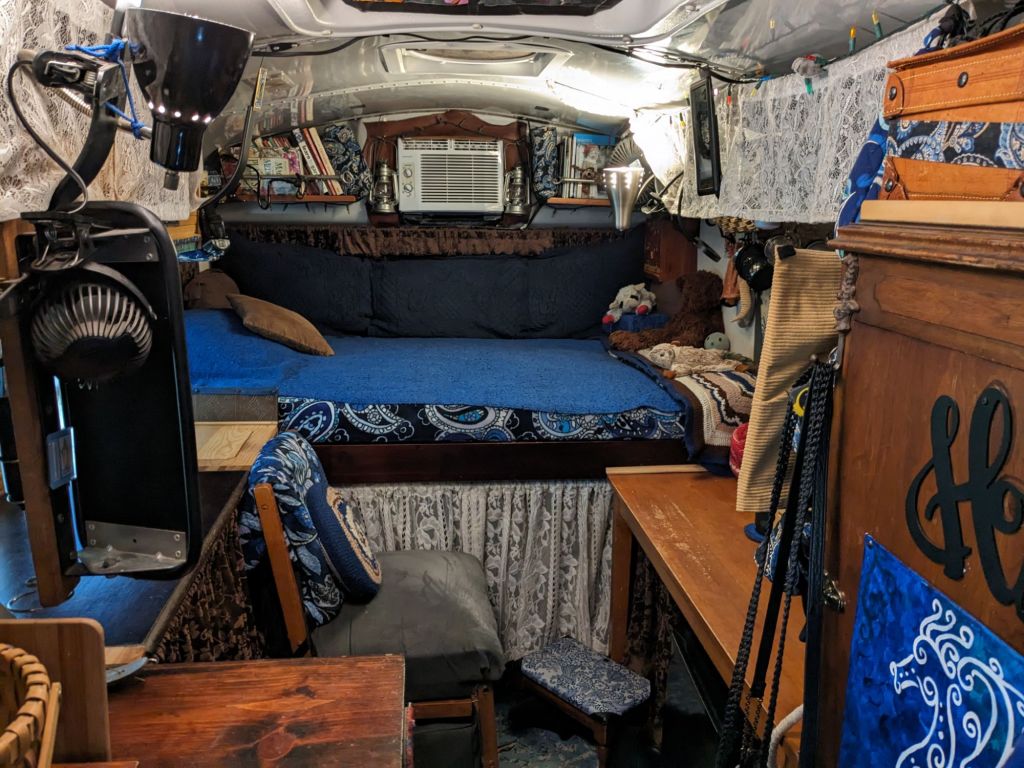 The back wall window A/C unit, I was going to replace it this year and modify the opening to make it tilt back a bit more. The wall around it is not finished. The black tape is just covering the sharp metal edges and holes from the old bus AC unit I paid to have removed and capped off.