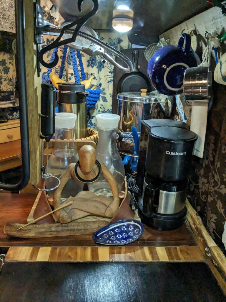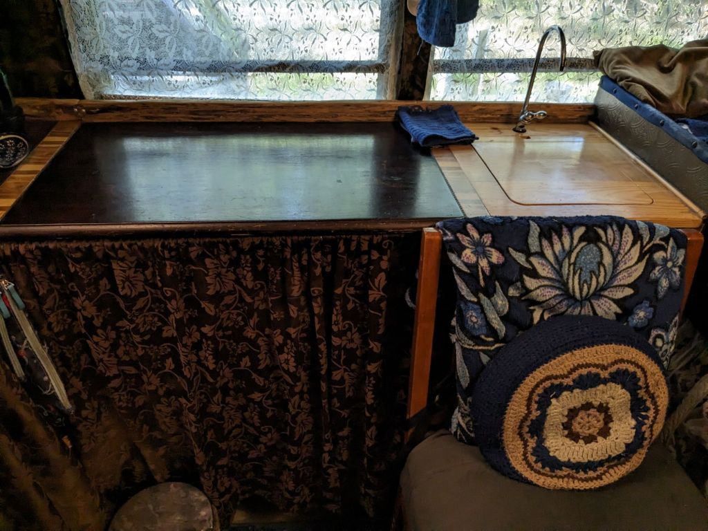 The counter has an inlay of cedar wood and chain I reused from the bottom of the antique cedar lined wardrobe I modified. Still need more layers of poly.